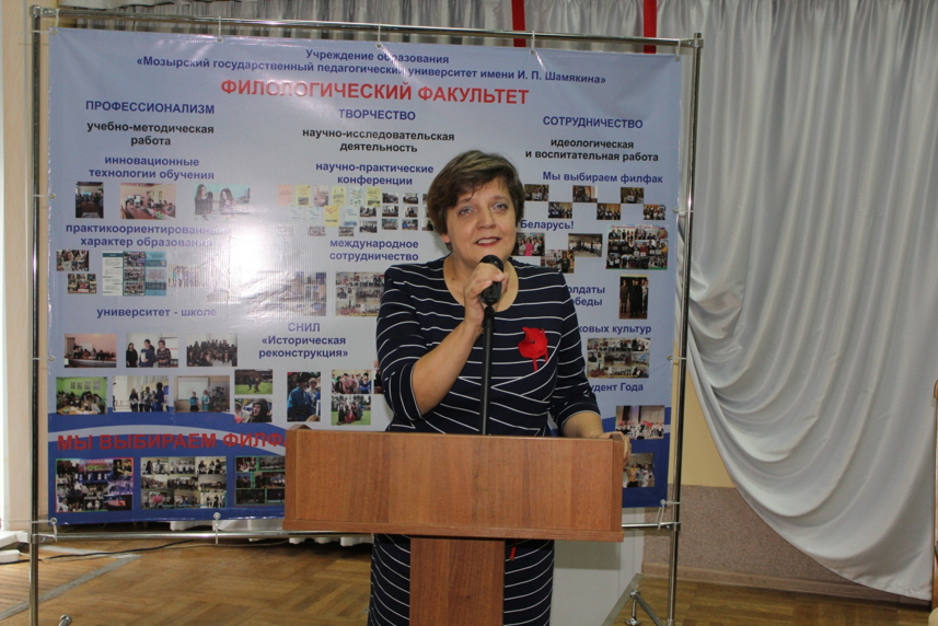 С приветственными словами в адрес студентов первого курса обратились декан филологического факультета Т.Н.Сыманович, председатель профкома студентов и преподавателей университета В.В. Струков, ответственный за организацию воспитательной работы на факультете И.Л.Судибор.